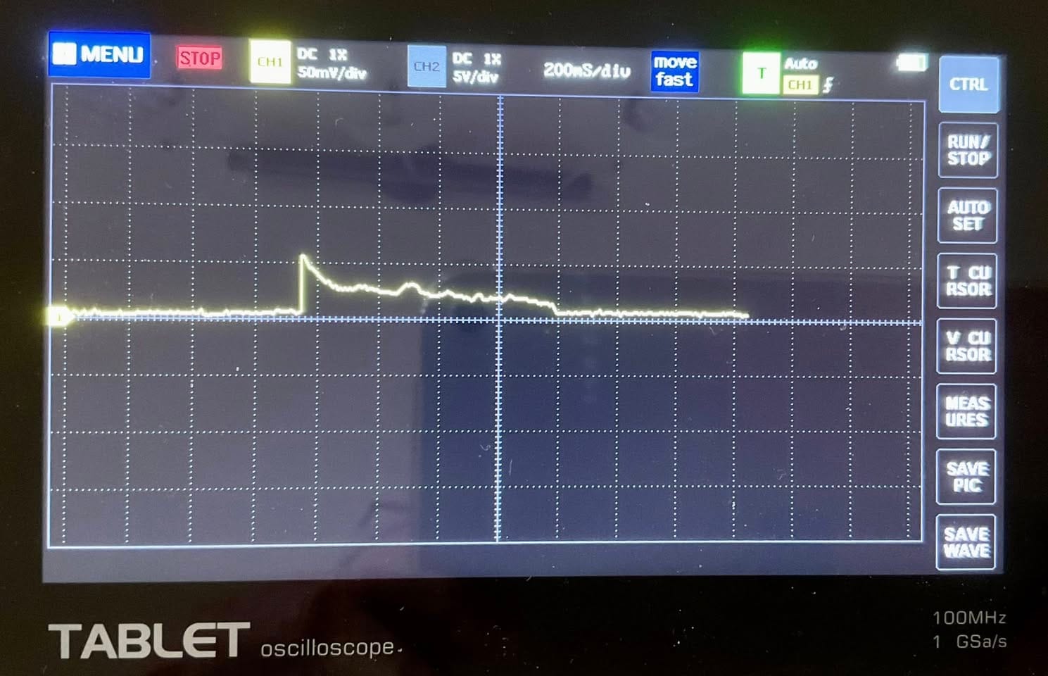 Engine start inrush current measurements.The scope is at 50mV/div. The shunt is 50mV for 500A. On the time axis we have 200ms/div. We see around 60mV so 600A inrush, quickly reducing to 300A after 200ms and the engine is running after 800ms.This is a large 5.7 liter Hemi V8 engine with a 1.4kW starter. In the graph you can see bumps upwards that repeat at similar intervals. I think this is the compression in the cylinders?